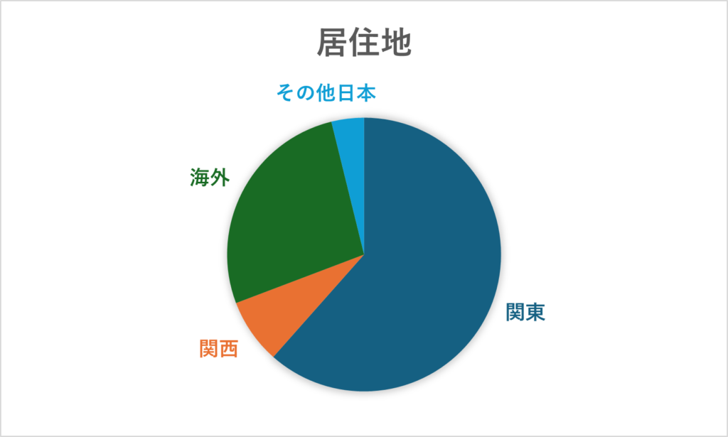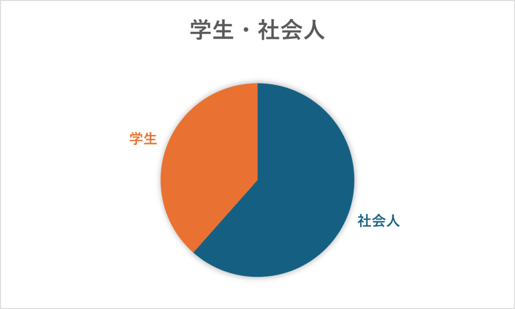 以下の円グラフの通り、参加者の属性は居住地、男女比、学生・社会人比、社会人参加者の内訳において一定の多様性が見られる。